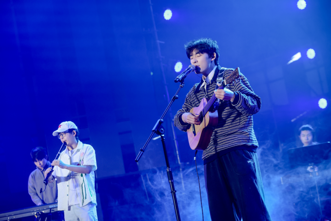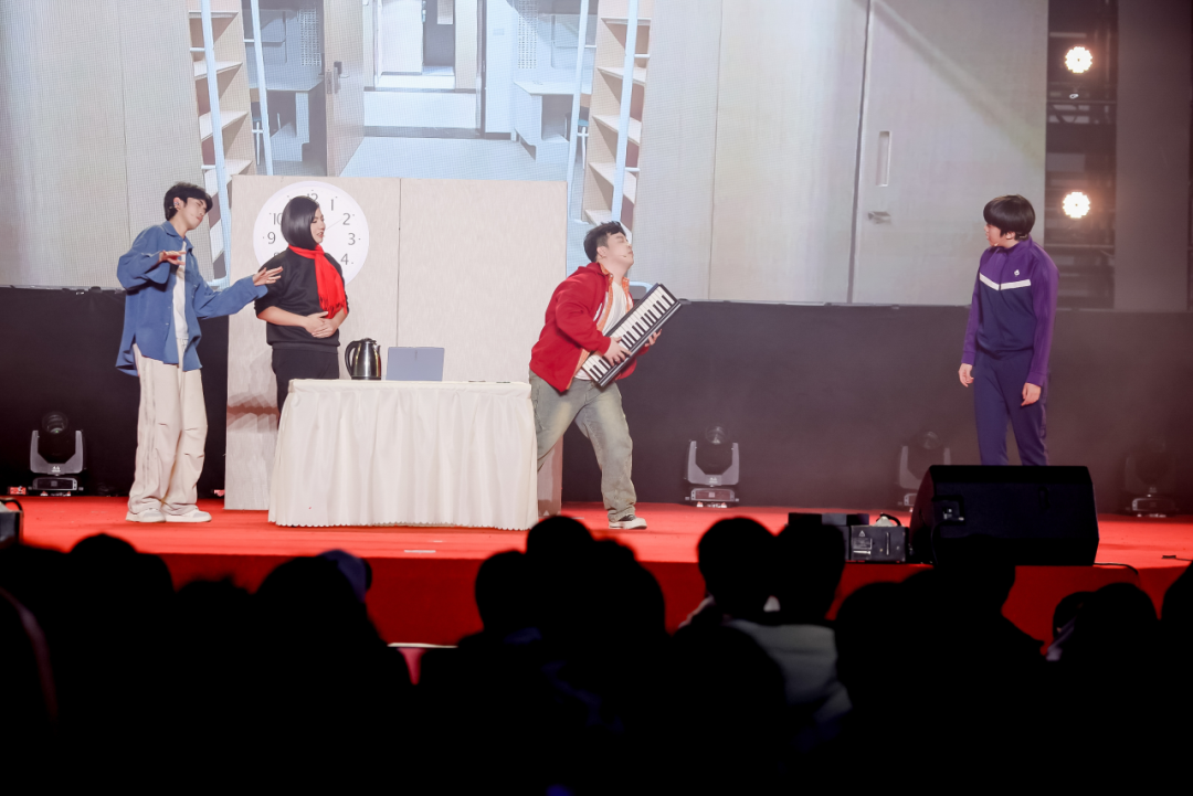 跳绳代表队创新地将花样跳绳项目搬上新年舞台,搭配青春动感的音乐,用高难度技巧惊艳全场,更展现了体育代表队同学们的精神风貌。非我日乐队携手学生艺术团民乐队,以欢快的《江风》邂逅原创国风曲目《水乡回音》,在电子乐器与东方民乐器交织中描绘一幅生动的水乡风景。学生说唱社持续发力,带来一首全新说唱曲目,热烈的舞台引发全场欢呼,动感节奏引领观众共同展望新的一年。