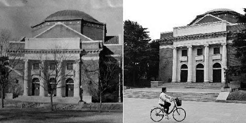 与当时相比,现在大礼堂的正门仍保持了原样。1940年夏天,日军在清华大礼堂前举行“军犬比赛大会”,让军犬进行撕咬中国人的比赛,数十个中国人全被咬死在大礼堂前的广场上。