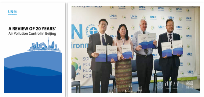 第三张拍摄于2018年——肯尼亚内罗毕联合国环境署一个重要会议上。会上正式发布了由联合国环境署委托清华团队和国际团队合作完成的《北京20年大气污染治理历程的评估报告》,报告显示北京从1998年到2017年20年间GDP增长13倍,机动车增长5倍,但大气污染物大幅度下降,空气质量获得明显改善。