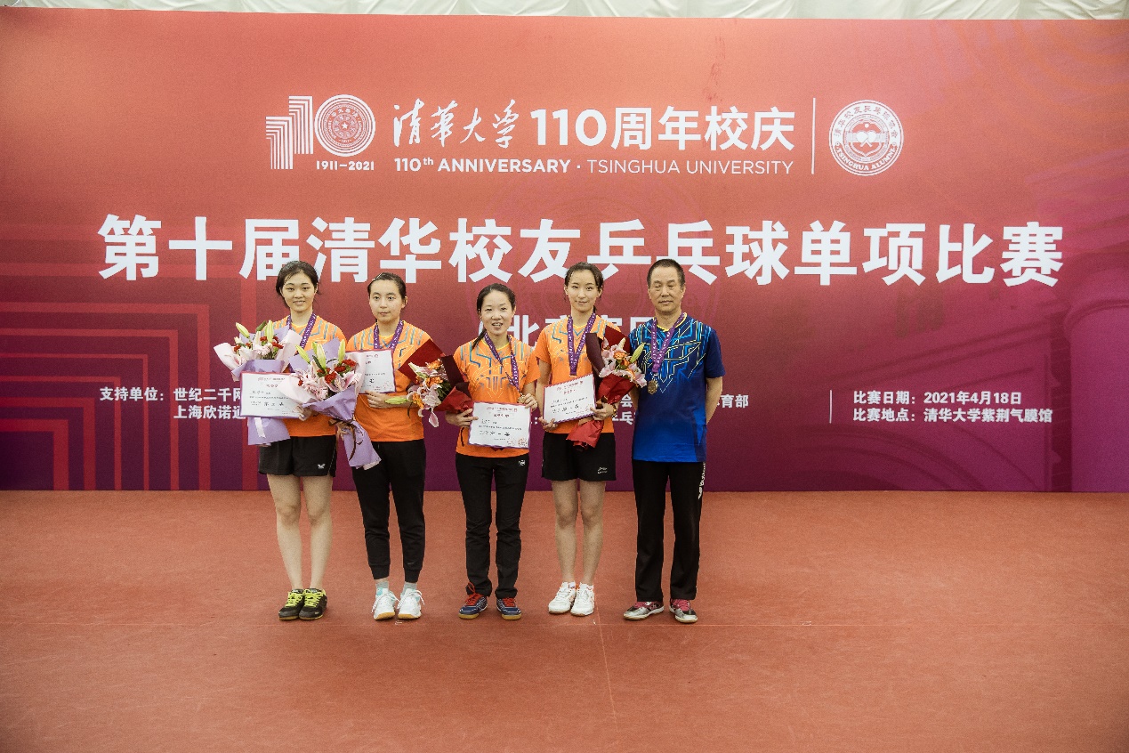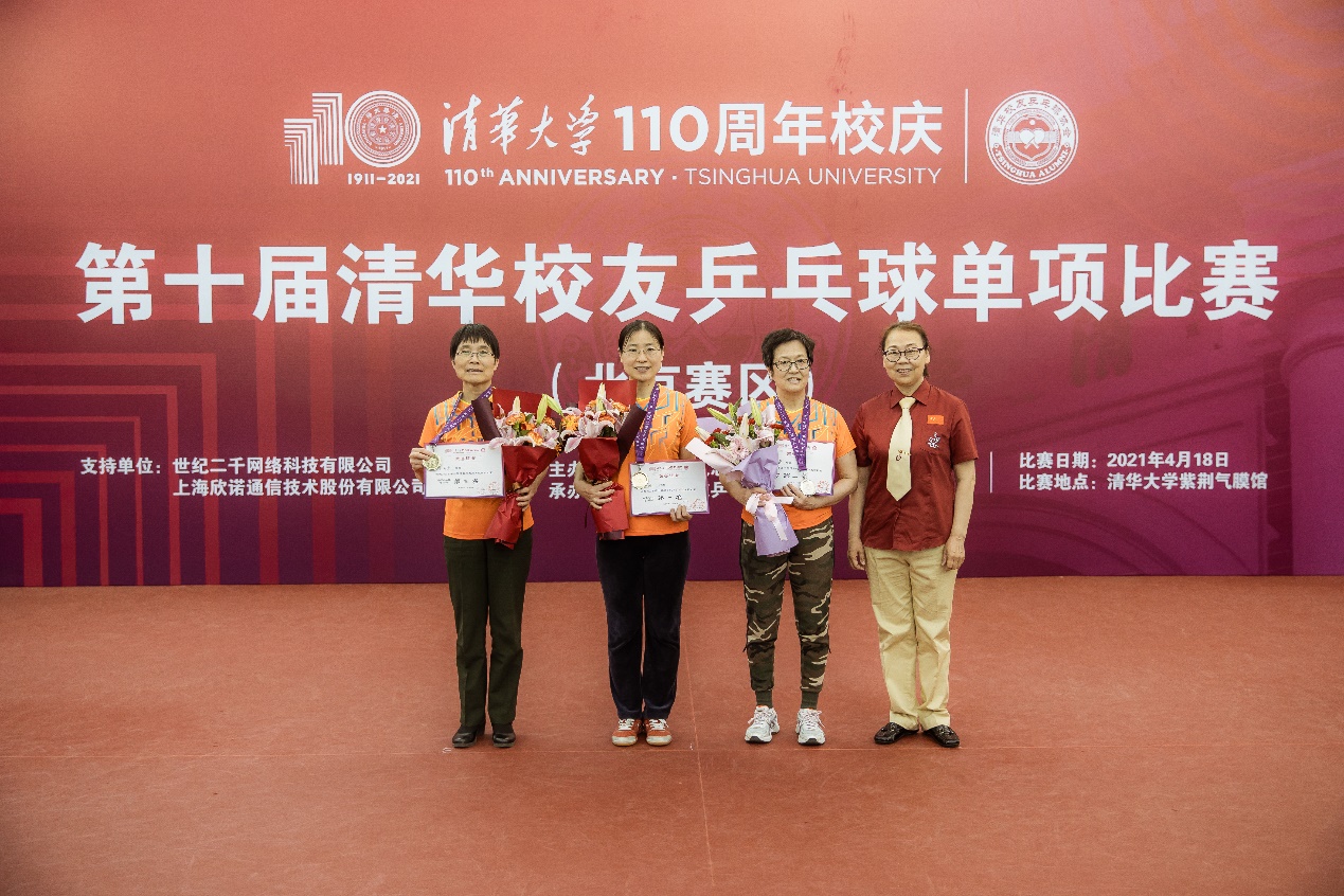清华校友乒乓球协会秘书长王欣为女子单打比赛40岁以上组(含40岁)的优胜者颁奖。获得女子单打比赛40岁以上组(含40岁)冠军的是于婷。