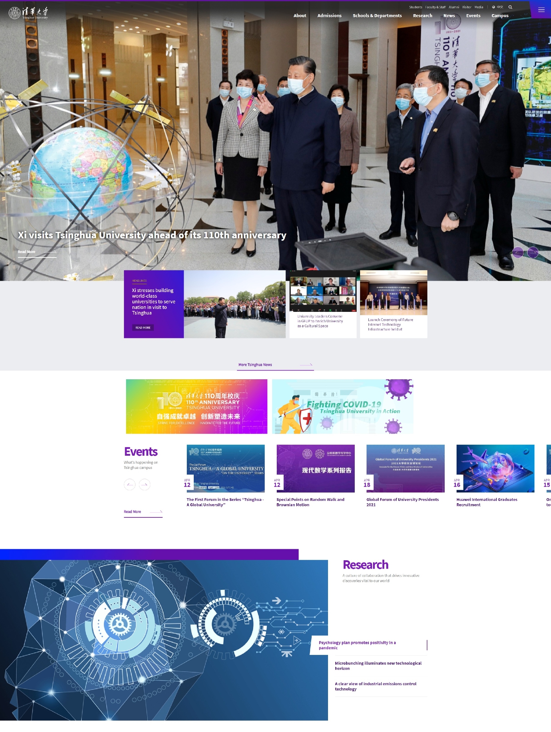新版主页在技术上基于2020年最新部署的主页网站群管理平台搭建而成,内容上由党委宣传部统筹建设、各部门单位分工合作,美术学院信息艺术设计系吴琼教授主持设计。在推进学校中英文主页改版的同时,党委宣传部自2020年起统筹推动全校各单位网站向新平台的迁移和改版工作,为学校多层多类主页建设、新媒体管理、媒体资源共享等提供有力的技术支持和平台支撑。主页是学校面向校内外宣传展示、提供信息服务的“第一窗口”,新版主页将持续丰富完善,为用户提供更便捷和人性化的服务,更好展示学校各方面的动态报道、信息数据、进展成果等内容。