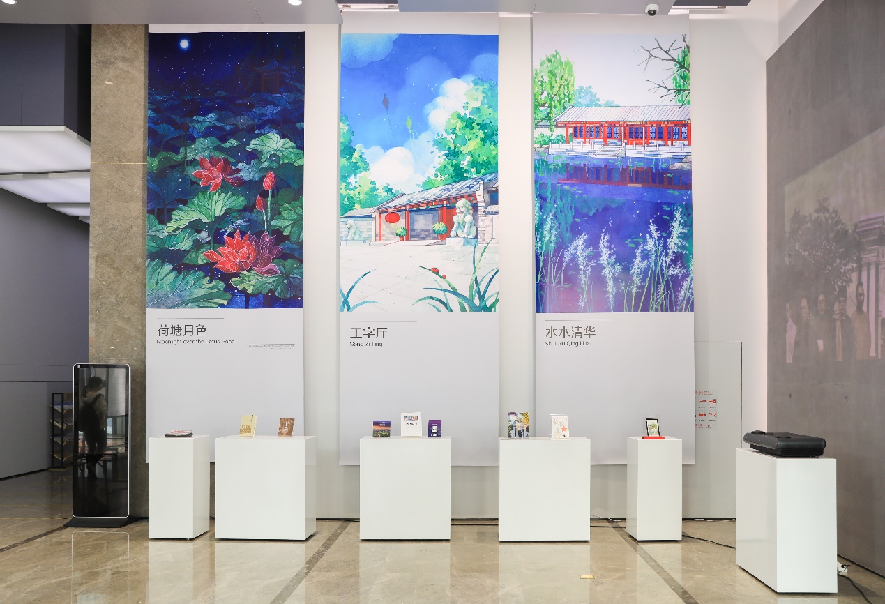 走进展厅,首先映入眼帘的是7幅以清华大学地标景色为背景并融合了清华精神和清华文化元素的大型条幅。大礼堂、气象台、清华二校门、清华学堂、荷塘月色、工字厅、水木清华,这是一代又一代清华人共同的回忆。精美的插画、鲜活的故事、熟悉的风物带大家领略清华园里四时的风景,感受那段激情燃烧的岁月。