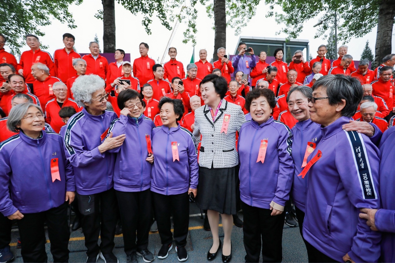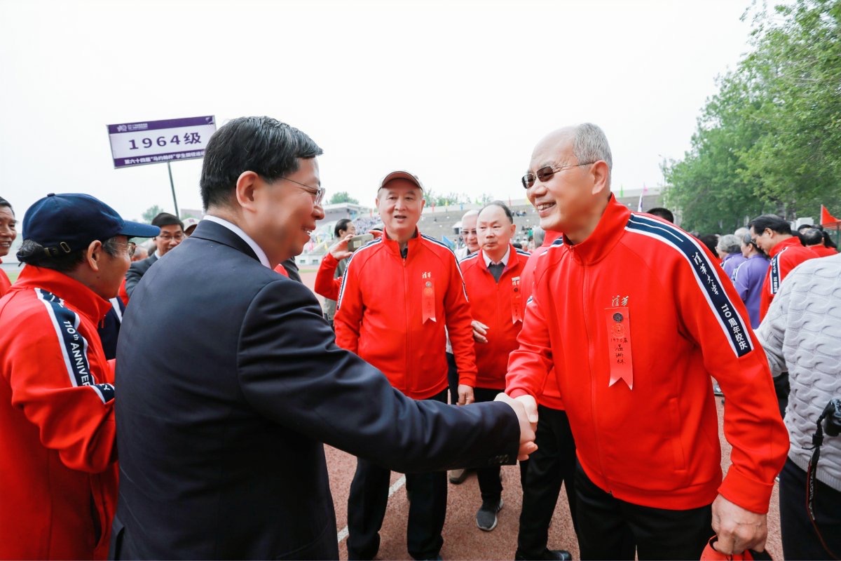 与此同时,东大操场北侧马路对面的“红场”已是人潮涌动,毕业10周年、20周年、30周年、40周年的校友们身着统一服装在这里列队排练。开幕式前,邱勇、陈旭也来到这些秩年校友方阵中,与他们握手、拥抱、合影,共话清华体育精神,现场气氛十分热烈。随后,邱勇、陈旭步入东大操场,在“无体育,不清华”的标牌前与毕业50周年的1964级、1965级校友方阵亲切合影。