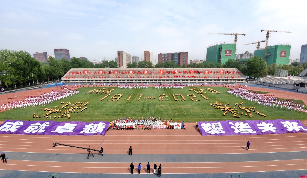 早上7:00,东大操场南侧的大屏幕上已经打出“自强成就卓越,创新塑造未来”的校庆主题图,屏幕上的现场直播在开幕式中全程持续。东侧看台上,“为祖国健康工作五十年”的口号与110面飘扬的旗帜交相辉映,营造了喜庆的校庆氛围。