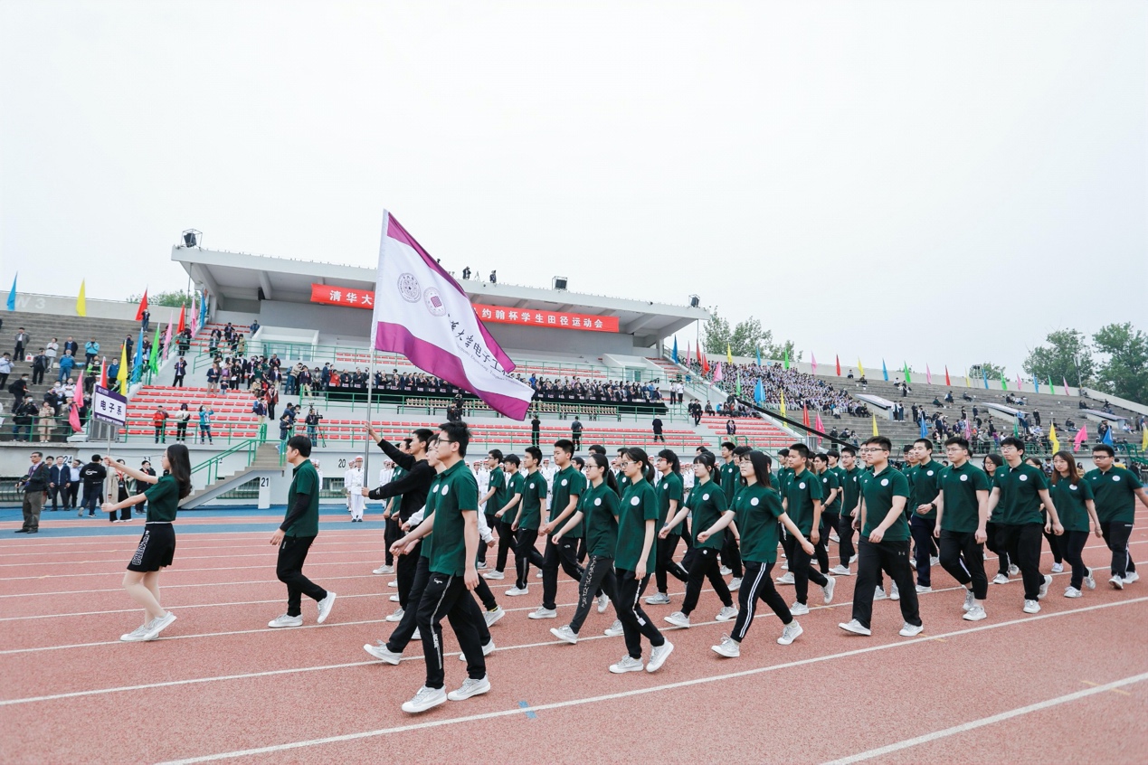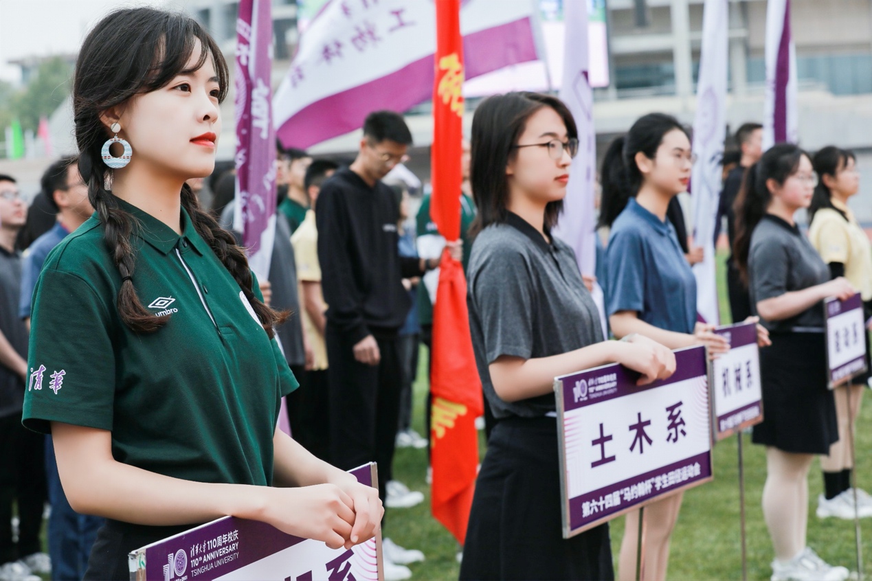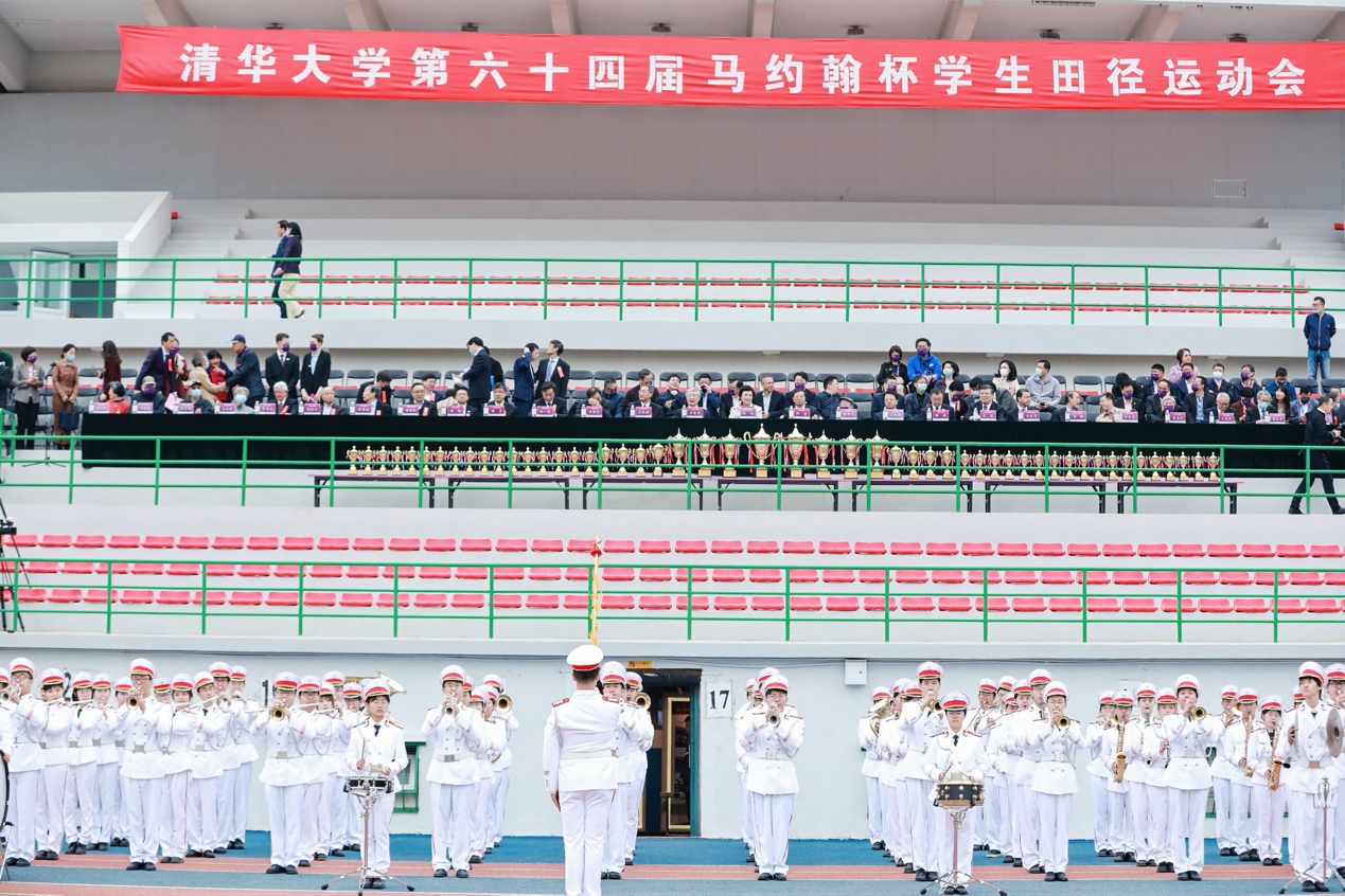 8:00整,伴着军乐队激昂的乐声,国旗仪仗队、校旗方阵、裁判员方阵、体育社团方阵、各院系运动员方阵和校友代表方阵依次入场。主席台和看台上的观众全体起立,为各个方阵鼓掌喝彩。铿锵有力的步伐、统一整洁的着装,每一个方阵在引导员、旗手和领队老师的带领下,高喊着具有院系特色的嘹亮口号,依次走入赛场,整齐划一地走过看台,充分展现出清华学子朝气蓬勃、拼搏奋进的风采和精神。