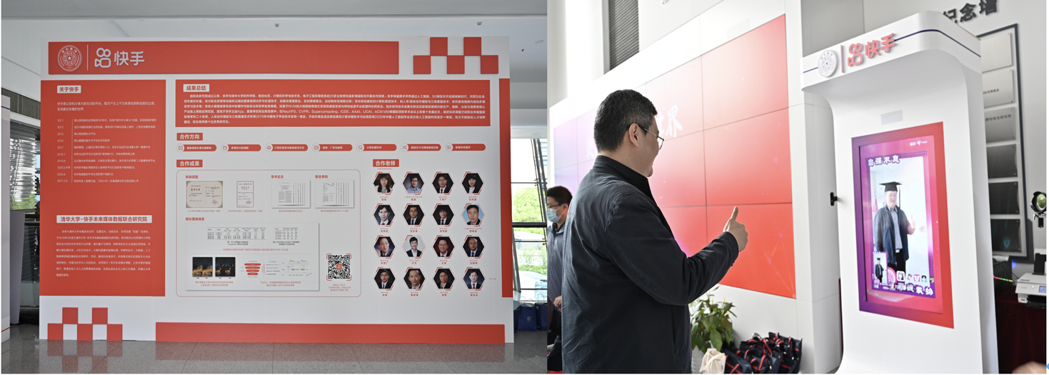 清华大学-快手未来媒体数据联合研究院成果展板(左)嘉宾体验快手魔表应用(右)