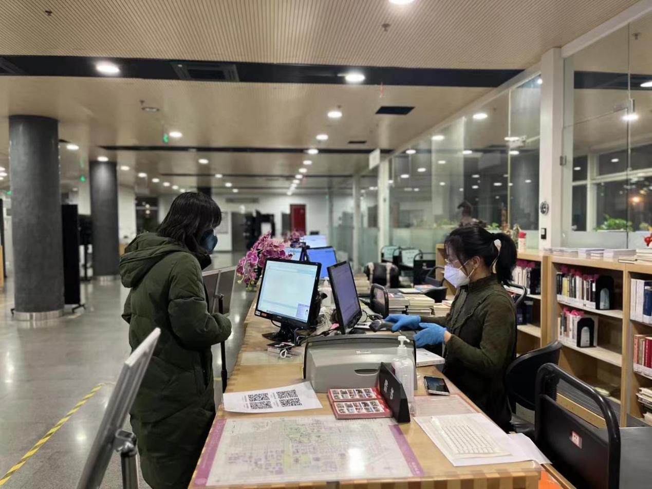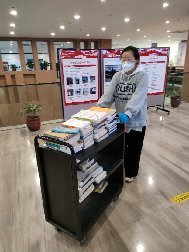 文科馆是同学们格外喜欢的自习场所,疫情期间仍保持较高的入馆人数和借还书量,在馆工作人员承担的业务量大,任务繁重。文科馆总服务台的吴晓飞主动承担了几乎所有晚班。年轻馆员贾虓涧和张帅、刘子正等外协人员一起,在多数同事不能到岗的情况下,身兼数任,除了负责借书、还书、咨询、保障总服务台流通外,还承担了落实入馆人员住处、发放物资等后勤工作,保障了自助文印业务的持续开展,以及配合学校流调等工作的开展。