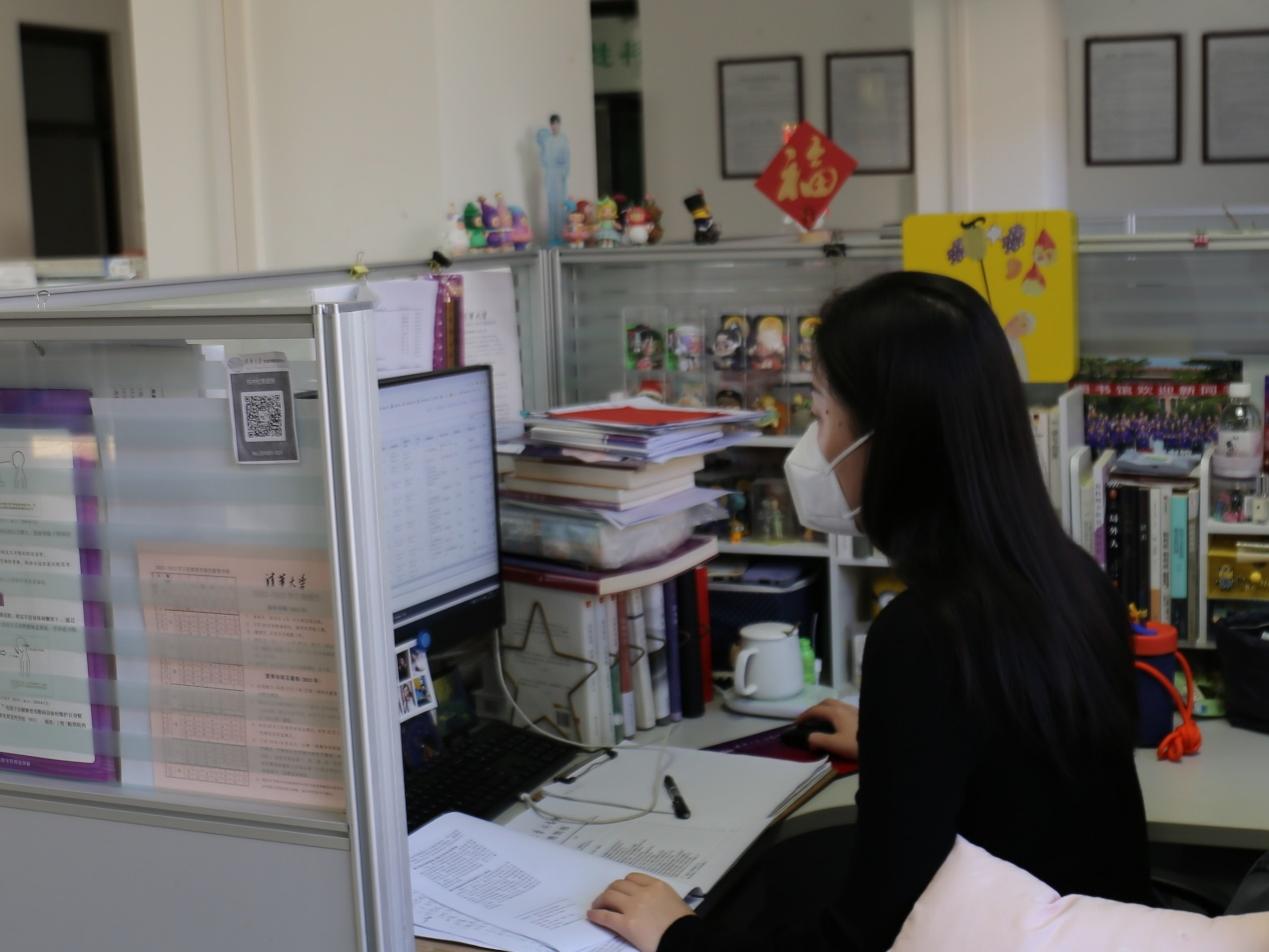 田兆雪、夏新月、肖萌萌是信息参考部的三位年轻馆员,其中田兆雪、夏新月是共产党员,肖萌萌是入党发展对象。接到通知后,她们在第一时间简单收拾了行李,就赶往图书馆,住在了办公室里。她们按照疫情工作小组统筹协调,一边开展业务工作,一边作为后备力量随时准备上一线工作。除了总咨询台线上线下值班之外,田兆雪也发挥着学科馆员精准服务的特长,为院系师生提供个性化服务。肖萌萌和夏新月忙着开具文献检索证明,保障线下文献检索证明和科技查新报告领取工作的正常运行。她们还担任起前方驻馆报道员的角色,根据每日主题,在馆内拍摄照片,并整合各业务口提供的素材,为读者及时展现疫情期间图书馆服务的方方面面。