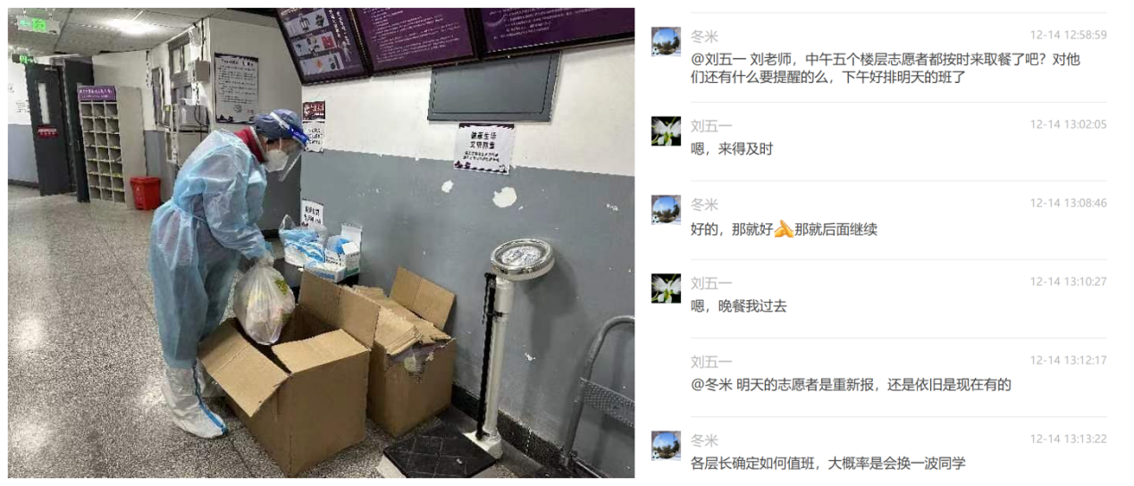 刘敏还在病毒感染后的恢复期,但仍然申请了承担第一周的线上志愿服务,与线下的刘五一配合,共同负责应急状态下面向楼内学生的信息发布,收集阳性同学订餐信息,组织楼内辅导员、骨干、志愿者队伍参与自助服务等。