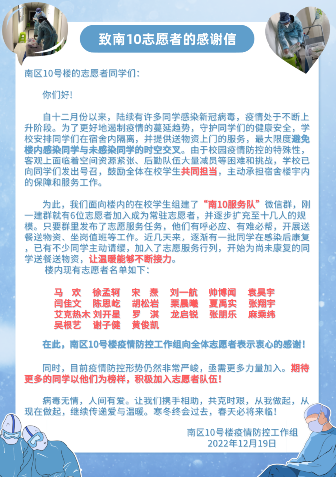 致南区10号楼志愿者的感谢信