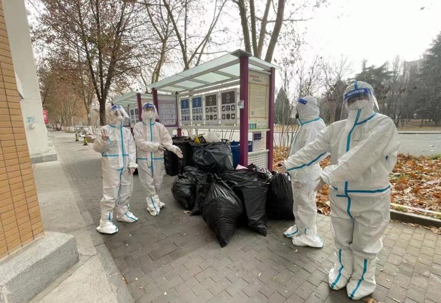 在后勤保障受到疫情影响后,垃圾清理成为了不少学生宿舍楼面临的新困难。医学院学生党员赵雨欣了解这一情况后,主动报名参与了学生卫生清洁志愿者工作。赵雨欣在完成志愿工作后感慨道:“亲身参与过,才能感受到保洁工作人员的不容易,我们平时习以为常的干净整洁,是他们日复一日的辛苦付出换来的。”新雅书院的喻含颖也是楼内志愿者团队的一员,刚刚病愈结束隔离的她负责楼里的消杀、清运和送饭工作。在志愿服务的过程中,让喻含颖感到最温暖的就是在每次工作之后都能收到同学们的感谢。提到工作的辛苦,喻含颖只说自己并没做什么,“保洁阿姨一天从早到晚要对楼里的公共空间消杀三次,志愿者只协助完成其中的一次工作,尽一点绵薄之力而已。”