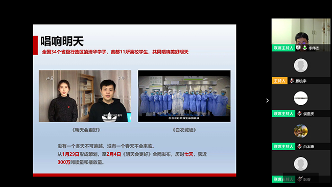 学生艺术团民乐队队员、清华校园原创歌手于盛分享了自己因受到医护人员事迹触动,自发创作音乐《白衣城墙》向白衣天使致敬的经历,通过艺术创作表达高校学子对疫情的关注与心声。
