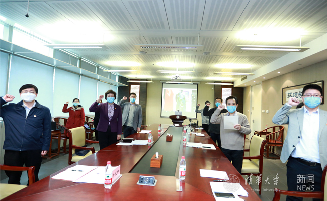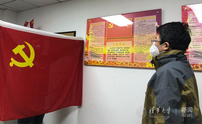 身在武汉虽只能一切从简,但张大奕依然早已精心准备。展开平整的党旗,请同事高高擎起。在刘书明的带领下,张大奕举起右拳庄严宣誓,与会党员重温入党誓词。两面鲜艳的党旗此刻在空中“交汇”,两地清华人滚烫的誓言跨过万水千山铮铮作响。