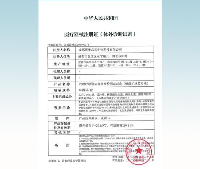 2020年2月22日,由博奥生物集团联合清华大学、四川大学华西医院共同设计开发的包括新型冠状病毒(COVID-19)在内的“六项呼吸道病毒核酸检测试剂盒(恒温扩增芯片法)”获国家药监局新型冠状病毒应急医疗器械审批批准(注册证编号:国械注准20203400178),为患者及一线医务人员提供快速、精准、有效的诊断。