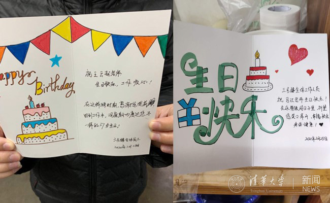 3月6日,正处于返京隔离期的教职工郝世叶收到了一份难忘的生日礼物——一张由四号楼集中住宿健康观察点的后勤教职工手工制作的生日贺卡,贺卡的结尾还有清华大学校长邱勇和校党委书记陈旭的手写签名。