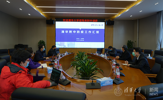 姜胜耀一行首先来到清华附中。附中校长王殿军全面汇报了附中的防疫工作。自疫情开始,附中紧急制定工作方案并成立学校领导小组以及各个工作组,紧张有序开展工作,摸排师生情况、保障校园安全、做好湖北以外地区人员返京在校隔离和监测等,确保疫情期间学校的和谐稳定。王殿军重点汇报了疫情防控期间,学校坚持德智体美劳五育并举,促进了学生的健康和全面成长,积极指导学生居家学习、生活,特别是毕业年级精准施策、高效教学等措施。