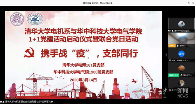3月14日晚,清华大学电博181党支部、华中大电气硕1908班党支部全体学生党员齐聚“线上”,以“携手战‘疫’,支部同行”为主题,举行两院(系)党建“1+1”活动启动仪式暨联合党日活动。清华大学电机系党委书记于歆杰、华中大电气学院党委书记陈晋、清华大学电机系党委副书记郑泽东、华中大电气学院党委副书记罗珺、清华大学电机系研工组组长钟海旺、华中大电气学院研工组许文立等参加活动。本次活动两校共有34名党员同学参加,活动由清华大学电博181党支部书记顾宇轩、华中大电气硕1908班党支部书记谢延共同主持。