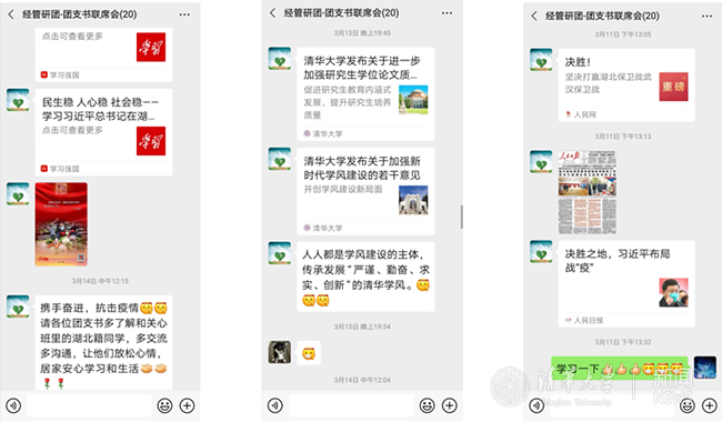 自新冠肺炎疫情发生以来,清华大学经济管理学院研团总支认真贯彻落实党中央和校党委的决策部署,在疫情期间加强集体建设,充分发挥学生党团组织的战斗堡垒作用。经管研团总支开展“从我做起,同心战‘疫’”云上主题教育活动,鼓励研究生以集体为单位,加强思想教育,保持应有的精神面貌,以强烈的责任意识和担当精神,为战胜疫情作出自己应有的贡献,助力集体在这次“大考”中交出一份经得起历史检验的答卷。