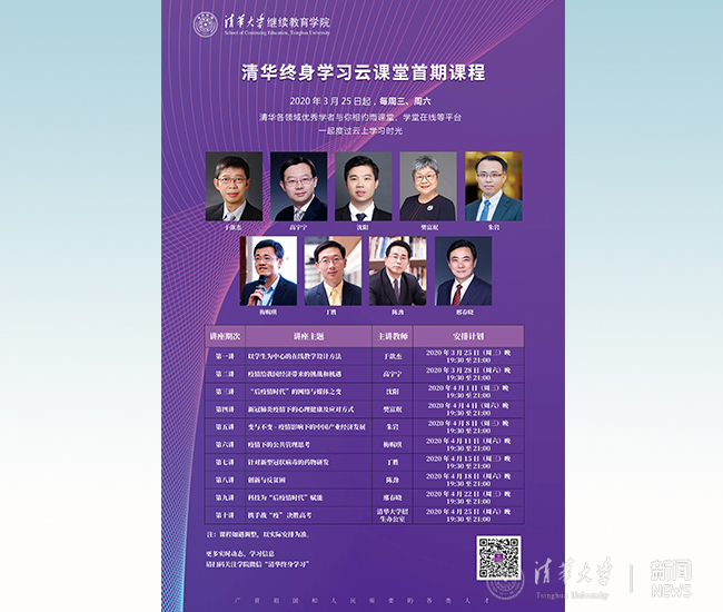 星空体育·星空网页版网站入口网3月27日电 抗击新冠肺炎疫情以来,在党中央的领导下,全国人民众志成城、共克时艰。为助力打赢湖北保卫战,做好坚强后盾,清华大学继续教育学院充分发挥在线教学优势,精心策划、周密部署、协同出击,推出“清华终身学习云课堂”,首期10门课程主要通过雨课堂面向湖北地区学员和清华校友直播,并通过学堂在线、学院官方微博等平台向全社会开放。