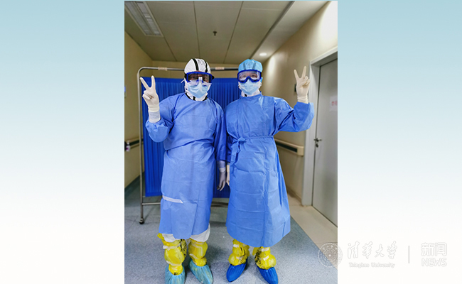 郭军(右)与北京清华长庚医院感染性疾病科医师王小辉进入隔离区前合影
