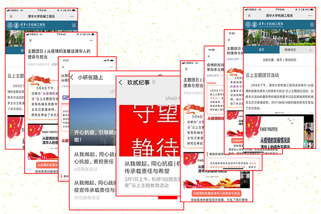 各基层党团支部集体广泛收集同学们面对疫情的心得和体会,共收集超过40余份心得感悟,整理形成超过3万字的文字材料。另外在“小研在路上”、机械工程系官网、“机械正发声”等各类媒体平台推送新闻稿件15份,产生良好反响。