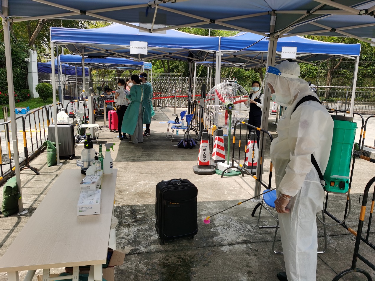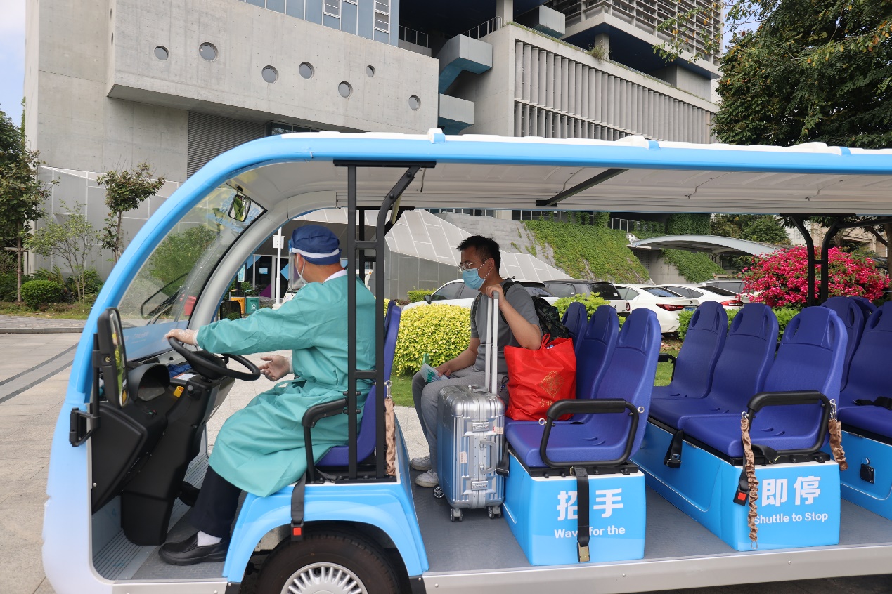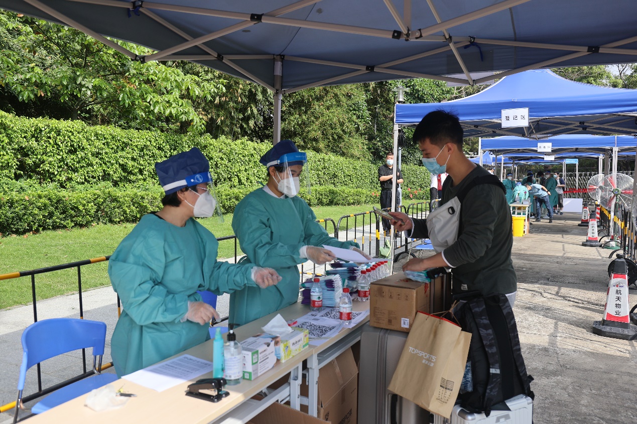 在校门口,防疫工作人员为同学们进行行李消毒,发放防疫物资,并安排摆渡车从校门口“点对点”将大家送往所在宿舍楼。返校的同学们将在宿舍进行三日健康监测,在校内划定区域完成核酸“三天三检”。