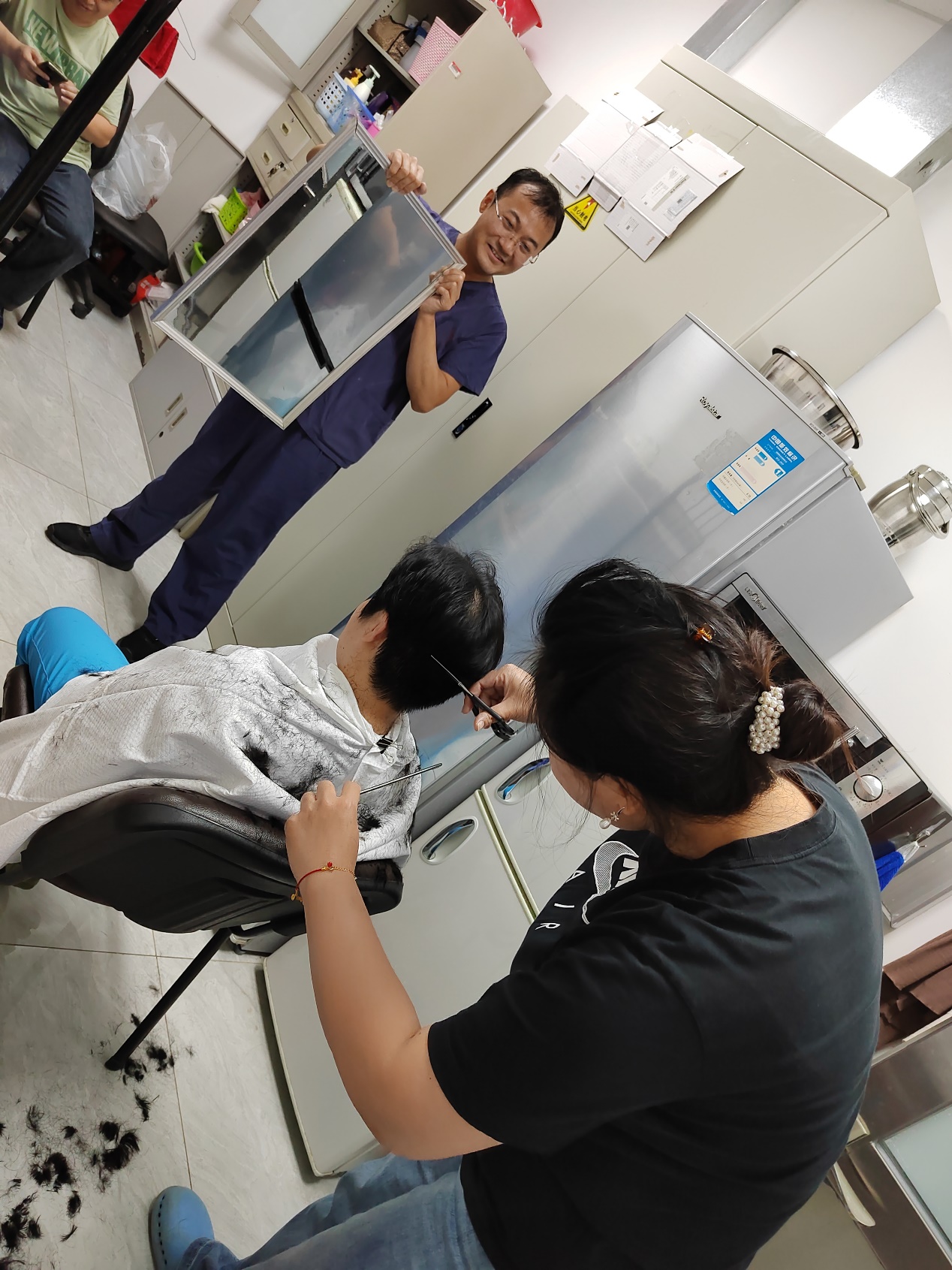 “我来!我会理发!”武天石自告奋勇要为同事们理发。同事们一个接一个排好队,嘴里还念叨着:“武老师,我要在你这儿办卡,充500块钱的!”一位同事举着镜子,武天石就地取“材”,把破布和垃圾袋当作理发围布围在“顾客”身上,用剪刀给大家剪发。