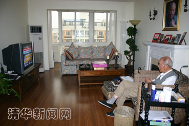 图为93岁高龄的著名水利水电工程专家、中国科学院院士、中国工程院院士张光斗先生在家中客厅藤椅上认真收看动员大会的实况。(记者 魏磊)