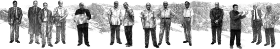从左至右依次为:郭永怀、赵九章、陈芳允、王淦昌、钱三强、王大珩、彭桓武、杨嘉墀、王希季、周光召、钱学森、邓稼先、朱光亚、屠守锷 (作者:毕建勋)