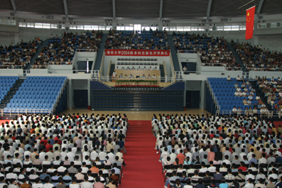 【新闻中心讯 记者 飞雨 摄影 郭海军】8月19日下午,3260名新生共聚综合体育馆,参加了“清华大学2004级本科生新生开学典礼”。校领导顾秉林、陈希、何建坤、岑章志、杨振斌、谢维和、孙道祥、胡显章、郑燕康,以及各院系和各部处的相关领导出席了开学典礼。副校长兼教务长汪劲松主持了开学典礼。