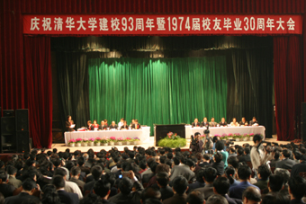 今天早晨10:00,大礼堂内座无虚席。近千名74届校友从祖国的四面八方赶到母校,共同庆祝清华大学建校93周年,并召开了1974届校友毕业30周年大会。