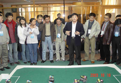 10月18号是首届全国博士生学术论坛计算机科学与技术分论坛的第二天。参加计算机科学与技术分论坛的30余名博士生参观了智能技术与系统国家重点实验室,大家首先观看了曾两次夺取RobCup世界机器人足球比赛冠军的的清华代表队的现场表演,机器人足球领队王磊为参观者演示了小型机器人足球队的比赛。演示结束后,记者采访了王磊同学。