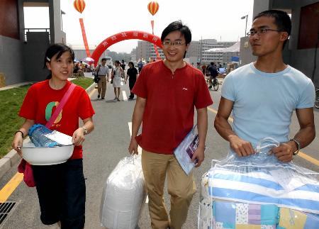 8月17日,清华大学同学送法学院新生邹海天(中)到宿舍。8月16日晨,一个长途电话打到清华大学学生处,四川新生邹海天因家庭贫困,路费、学费无着不能按时参加17日的开学典礼,希望推迟入学。校领导当机立断:决不能让任何一个考上清华的学生因经济困难而不能入学!请求成都清华校友会帮助解决。成都清华校友会成立6人小组,以最快的速度找到家住偏远山村的邹海天,并为他安排好食宿和机票。8月17日,邹海天终于按时来到了他梦寐以求的清华园,通过学校“绿色通道”办理了临时贷款,并办理了各项入学报到手续。