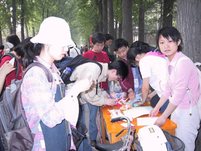 在南北主干道的两侧,记者看到,在两条长长的丝带上系满了五颜六色的千纸鹤,一个个随风飘舞,在道路两旁,挤满了准备在千纸鹤上留言、签名的清华学生。这是清华大学紫荆志愿者总队和爱心协会发起的“千纸鹤行动”,希望每个人都来折一个小小的千纸鹤,以表达所有清华学生对于辛勤工作在治疗“非典”一线的医护人员的敬意和祝福。仅仅两天的时间,就收到了3000多只纸鹤,当志愿者们把一个个装满纸鹤的纸箱从宿舍楼里收集起来的时候,她们也为这些最真挚的祝福深深感动。