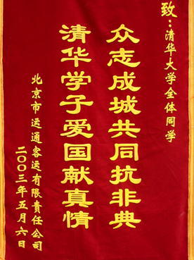 ,并接受了《致清华大学全体同学的感谢信》和锦旗。同学代表也表示,现在全体清华人正团结起来共同抗击“非典”,学校正采取一切有效的措施,防止“非典”在校园里流行,同学们在这样的特殊时期克服困难,努力学习,与首都劳动者共渡难关。简短的交流后,双方进一步加深了相互的理解与支持,表示在党和政府的坚强领导下,全社会团结起来,众志成城,共同努力,互相鼓励,就一定能夺取抗击“非典”的胜利!