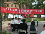 5月18日上午,由校研究生团委组织的“阳光论坛”系列活动之博士生报告团辩论赛在十食堂西侧小树林拉开了帷幕。双方围绕SARS是一个医学问题还是一个社会问题展开辩论。参加活动的8名辩手由博士生报告团成员组成,他们分别来自材料、建筑、经管等不同的院系。辩论现场共安排了50多个观众座位,早在辩论开始之前就已经座无虚席了,周围还有不少同学站着观看,场面非常热烈。