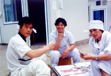 | 雷师傅(左一)在和另外两个卫生员打牌,输了要在耳朵上挂纸条 |