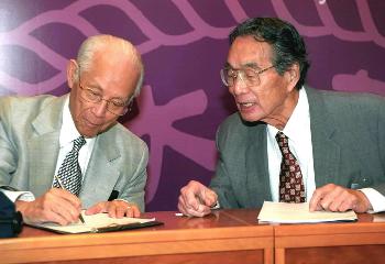 8月30日,著名应用数学家、中科院外籍院士林家翘教授(左)与美国加州大学教授、中科院外籍院士冯元桢在清华大学周培源应用数学研究中心成立大会上。当日,清华大学周培源应用数学研究中心成立,以推动我国数学与科学之间的交叉性和前瞻性研究。该中心聘请国际著名应用数学家林家翘教授为名誉主任,聘请世界知名数学家、美国布朗大学教授谢定裕博士为主任。新华社记者王呈选摄�/p>