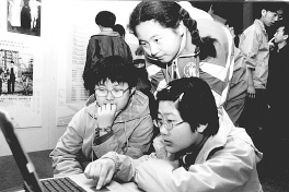 《今日清华———清华大学建校90周年成就展览》4月7日在中国 历史博物馆开幕。图为清华附中的同学在用展会上的笔记本电脑浏览 清华大学建校90年来所取得的辉煌成就。
