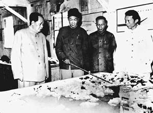 1959年9月毛泽东视察清华大学师生参加设计的密云水库时,听取张光斗教授(右一)的汇报。