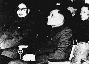 1966年1月,邓小平(中)参观高校科研生产展览时,观看清华大学的展品。