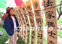 清华大学校庆之日,法学院师生在清华教学区南北方向主干道上设置的仿竹简展台创意颇新。中新社记者 张勤 摄