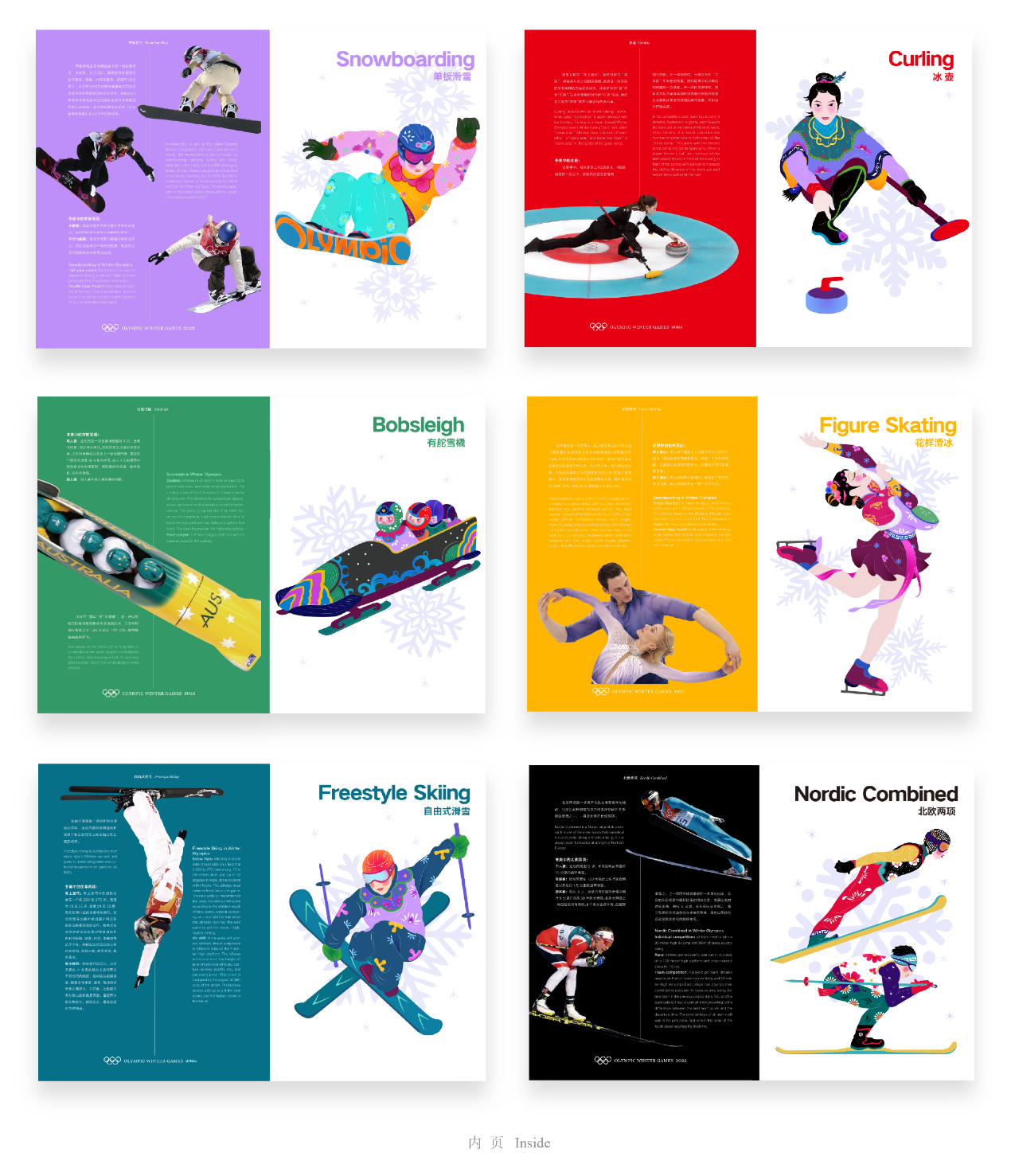 同时,出于普及冰雪运动常识的目的和尝试融合传统图形与现代国际赛事视觉设计的初衷,任和以现有图形为基础,设计了一本介绍各项赛事的图册,册页中插入印有设计图形的透明菲林片,以透明介质还原蔚县剪纸画面通透、正反都能观赏的特色,也进而延展出一套纪念邮票。