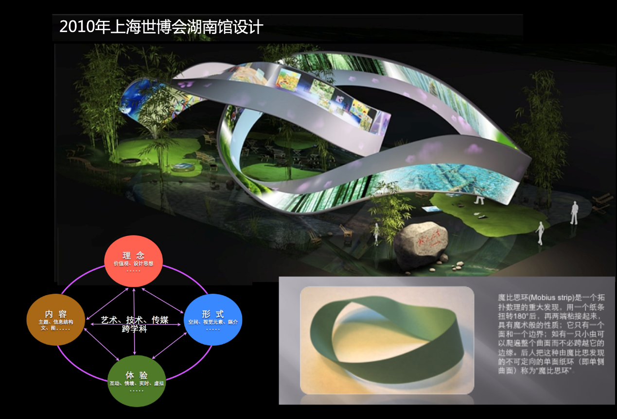 2010 年,鲁晓波担任上海世博会湖南馆的设计总监。他颠覆了以实物、展板配合长方形屏幕的传统展览形式,创造出一个雕塑式展示空间,运用莫比乌斯环形态,在高2.4米、总长240米的环带上滚动播放所有影像内容。观众可以通过电子彩笔在电子壁画上涂鸦,描绘自己心中的家园。同时,鲁晓波决定全部采用竹子和纸张作为场馆设计的原材料,既有人文意蕴,又低碳环保。鲁晓波始终秉持“隐藏技术,为情境服务”的理念,让参观者切实感到“身临其境,难辨虚实与震撼体验”,最终收到了令人满意的设计效果。