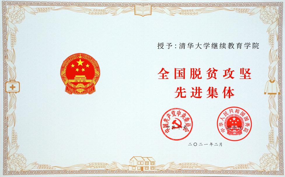 2021年2月25日上午,全国脱贫攻坚总结表彰大会在北京人民大会堂隆重举行。习近平总书记出席大会并发表重要讲话,大会对全国脱贫攻坚先进个人和集体进行表彰,清华大学继续教育学院荣获“全国脱贫攻坚先进集体”。4月19日,习近平总书记考察清华时,在座谈会上专门提到了清华的这些成绩,这是对清华大学主动承担社会责任、服务国家和社会的充分肯定。