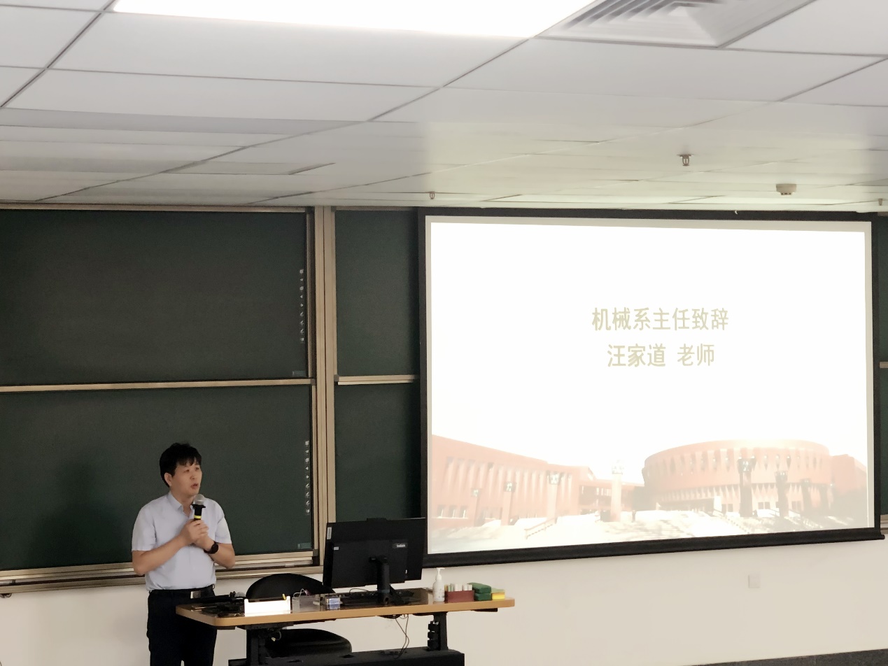 首先,机械工程系主任汪家道对2022级全体研究生新生同学的到来表示热烈欢迎。他从自身经历出发,向新生们提出两个问题:一是研究生期间,应该选什么样的课题?汪家道表示要紧密围绕“四个面向”开展科学研究,即面向世界科技前沿、面向经济主战场、面向国家重大需求、面向人民生命健康。汪家道表示,我们应当着力解决“卡脖子”问题,要引领机械科技前沿发展,为国家、为人民、为社会作贡献。二是应该怎么做课题?汪家道指出要大胆地提想法,勇于创新、大胆实践,要充分利用图书馆等知识资源,要敢于同大师学者进行交流,要善与同导师沟通。