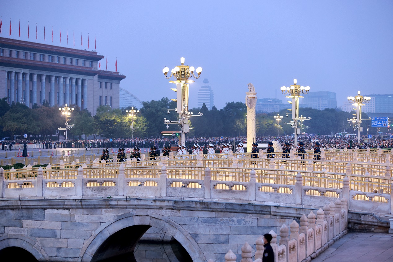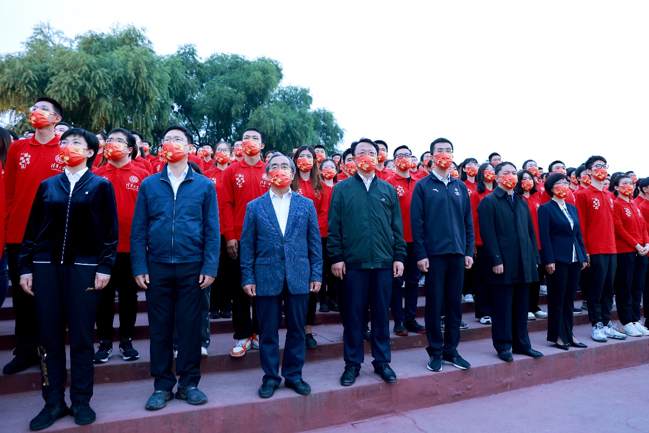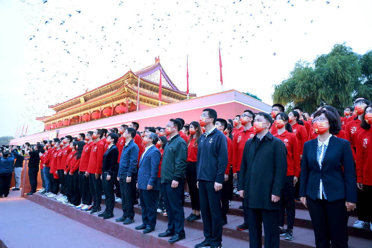 清晨6时许,装扮一新的天安门广场庄严肃穆。伴随着军乐队整齐的鼓点,升旗仪式正式开始。来自清华大学各院系的400名师生代表来到天安门观礼台观看升国旗仪式,满怀崇敬、激动的心情,共同庆祝中华人民共和国成立73周年,迎接党的二十大胜利召开。