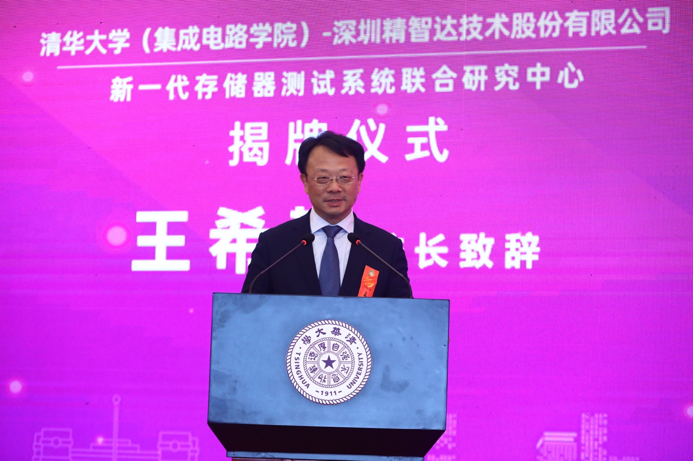 王希勤、张滨代表双方共同为“清华大学(集成电路学院)-深圳精智达技术股份有限公司新一代存储器测试系统联合研究中心”揭牌。