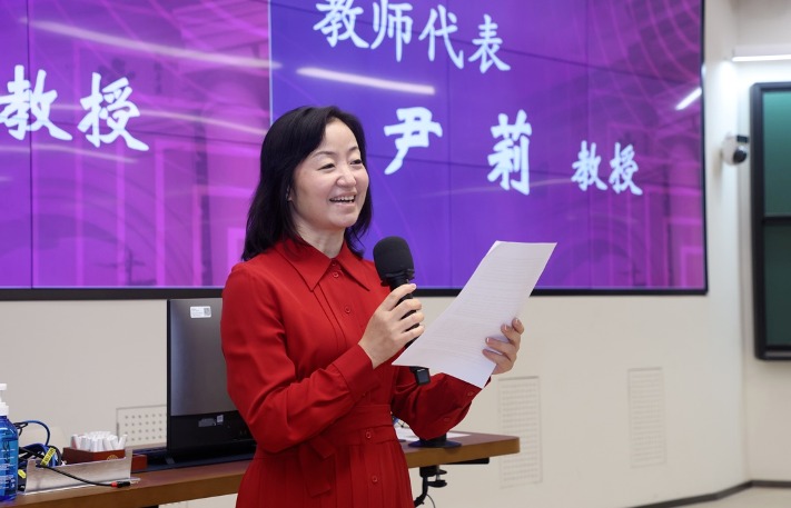 教师代表尹莉代表外文系全体师生向2023级新生表示祝贺和欢迎。尹莉分享了两位校友的求学经历和如今取得的优秀成绩,重温了清华外文系的精神和传统,鼓励新生广泛涉猎、融会贯通,大胆进行跨学科探索,在新时代的奋斗路上保持热爱,勇往直前。