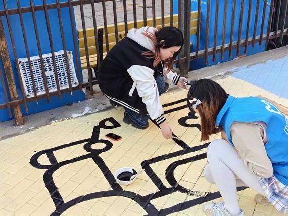 今年3月14日,在前期策划设计的基础上,清华大学电子系无33团支部与美术学院美21、22团支部17位同学来到青云北社区,将前期设计的功能性彩绘图案落地社区。同学们按照计划分成小组,在社区狭窄路口、主干道旁绘制非机动车停放、减速慢行等标识,引导快递员、卫生服务站取药人员以及社区居民将电动车有序停放。同时,彩绘也美化了社区环境,助力文明、安全的社区氛围打造。